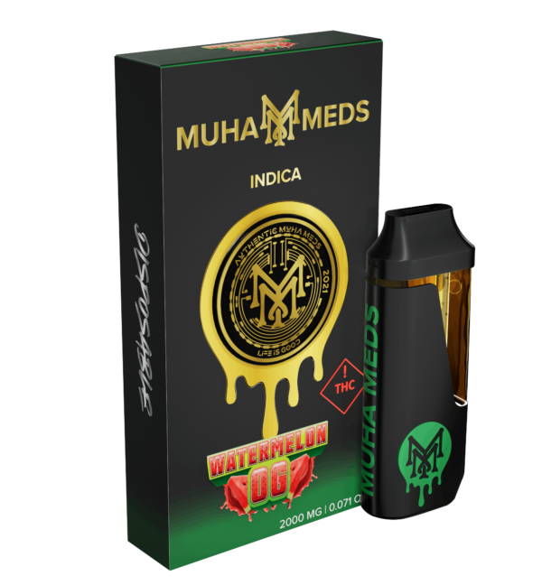 Muha Meds Watermelon OG 2g, Muha Meds Watermelon OG disposable, Muha Meds Watermelon OG 2000mg, a premium disposable vape featuring 2g of high-quality cannabis concentrate with a potent 2000mg formulation. This product boasts a delightful watermelon flavor, providing a refreshing and enjoyable experience.